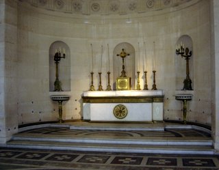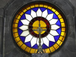 Behind each of the statues is a stairway that leads to the crypt which is open to the public, and to the sacristy which is not. The crypt is simple in design with a brilliantly colored, circular stain-glass window directly behind the altar.
