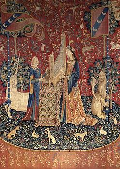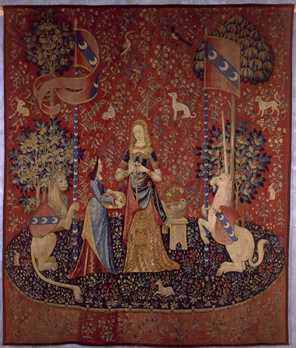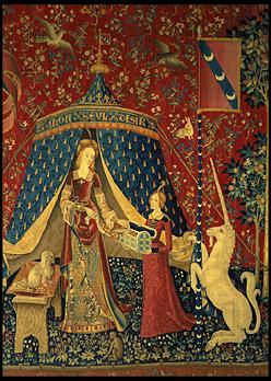 This tapestry has received a number of interpretations. One sees the Lady putting the necklace into the chest as a renunciation of the passions aroused by the other senses and as an assertion of her free will.