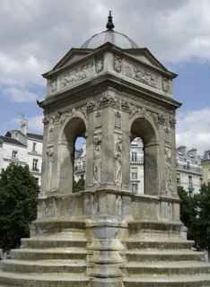 When this church was demolished, the Fountain was moved to the middle of the Market. At that time, 1788, a fourth side was added, built by Pajou and decorated with sculptures in bas-relief by Houdon. These sculptures are on the south side of the fountain.