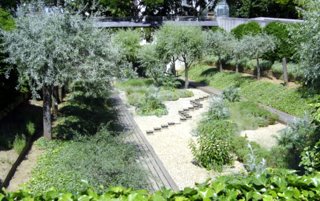 The entrance to the Silver Garden is a descending ramp, bordered by walls on both sides. These walls increase in height as you descend into the Garden, increasingly restricting your view. At the end of the walls, the Garden suddenly appears. This garden has an arid aspect to it with gravel walkways, olive trees and sage.