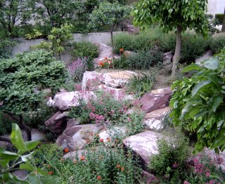 The Orange Garden is accessed by a tunnel. Its central feature is a flow of rocks spreading out from the trail that cuts through a variety of Japanese azaleas and alstroemerias, planted amongst pine trees.
