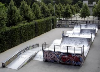 To the south of this creation is an enclosed skateboard/rollerblade park with slopes and jumps made of metal.