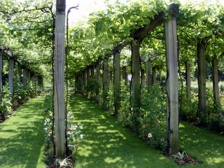 There is a pond which is bordered on both sides by wisteria covered square columned arcades.