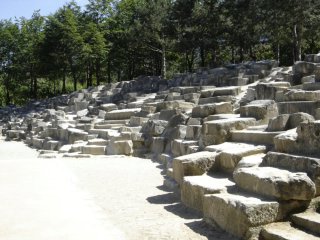 The terrain of Parc Georges Brassens is on the gradual slope of a hill and the park grounds undulate with several small knolls. There are many trails that wander around these small knolls leading to a variety of differently designed sitting areas. One of these knolls is actually a small hill and offers a panoramic view of the immediate area.