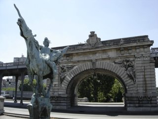 On the east side of Pont de Bir-Hakeim is a striking statue of a young man, with a thrusting sword, atop a horse that seems ready to fly out over the river. The statue is called, "La France Renaissante", or "France Reappearing". It was created by the Dutch sculptor Wederlink and offered by the Danish colony of Paris in 1930.