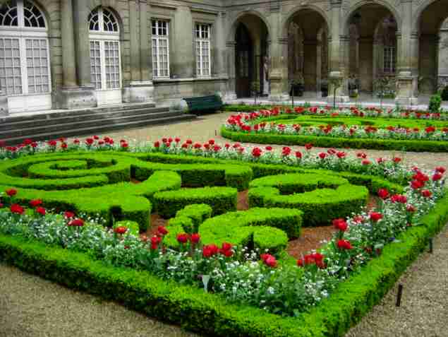 Entering the courtyard from rue des Francs Bourgeois you are presented with a small, beautifully designed garden with gravel paths.