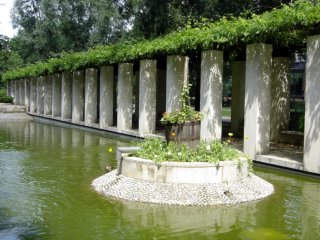 There is a pond which is bordered on both sides by wisteria covered square columned arcades.