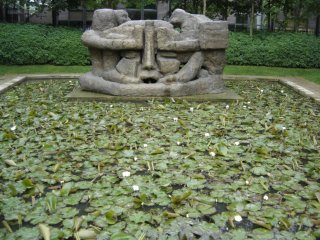 On the east end of Cour St. Emilion is a pond covered with water-lily plants. In the pond is a sculpture called "La Demeure #10" created by Etienne Martin in 1968.