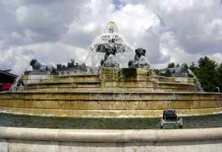 At the main entrance to Parc de la Villette is the Fontaine aux Lions, the Fountain of the Lions, created in 1811. It sits in front of the old tallow melting warehouse, built in 1867, what is now the Maison de la Villette, an Exposition Hall covering 1,130 square meters.