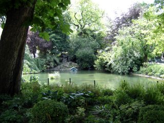 The Garden in the Square du Temple was designed by Alphand in 1867 in the English-garden style. There is a large pond with a small waterfall cascading over rocks brought from Fountainbleu. The pond is surrounded by green and flowering shrubs and some rare varieties of trees.