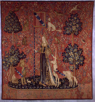 This tapestry has received a number of interpretations. One sees the Lady putting the necklace into the chest as a renunciation of the passions aroused by the other senses and as an assertion of her free will.