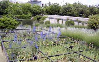 The Blue Garden doesn't seem to have borders. It also doesn't have any trees. It does, however, have metal frameworks which support clematis vines and an arbor of wisteria. Found here are delphiniums, lavenders, irises, campanulas, ceanothuses and stachys.