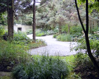 The Red Garden is an open lawn with a downward slope leading to its red-rock garden. On either side of this garden are tree-lined terraces.